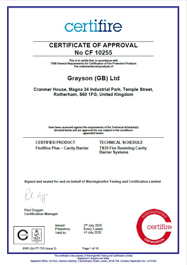 FireBlox™ Plus is fire rated up to 120minutes integrity and insulation (EI120) please check application chart